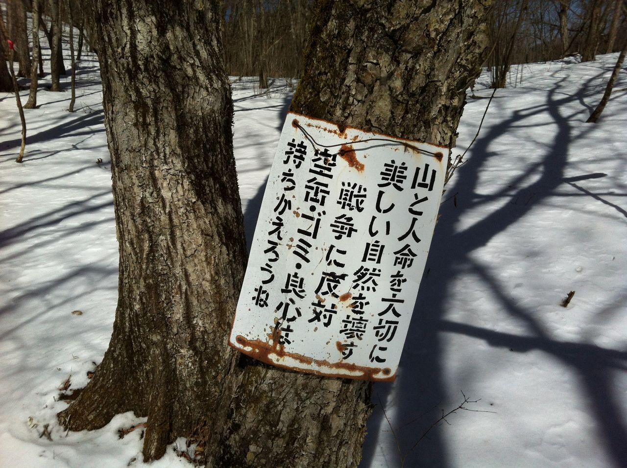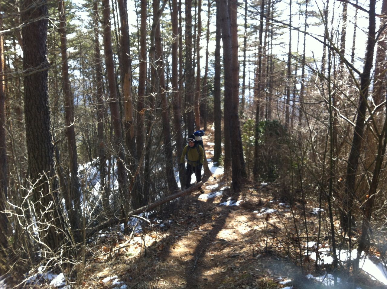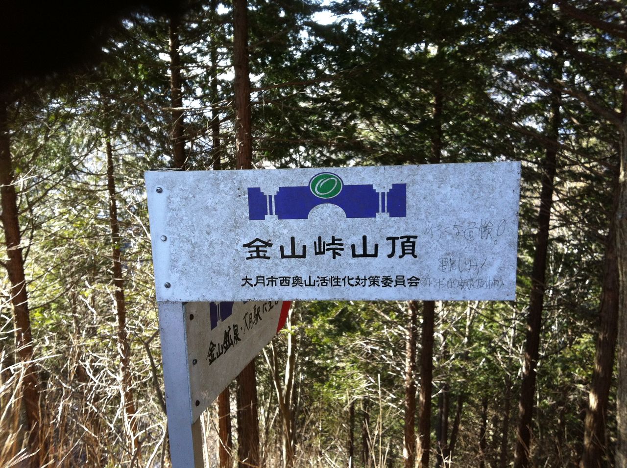 まずは金山峠を目指します。2人ともにザックの重さは20kg!二言目には「重たい。重たい。」を繰り返して歩きます。金山峠までは不明瞭な道で赤テープの目印を頼りに進みました。峠頂上に登る急坂があるのですが目印も無くどこを登ればよいのかかなり迷いました。 何とかたどり着き標識を見ると『行くな危険!整備しとけ!・・・」との書き込みが。書き込みは感心しませんが、何となく気持ちはわかりました