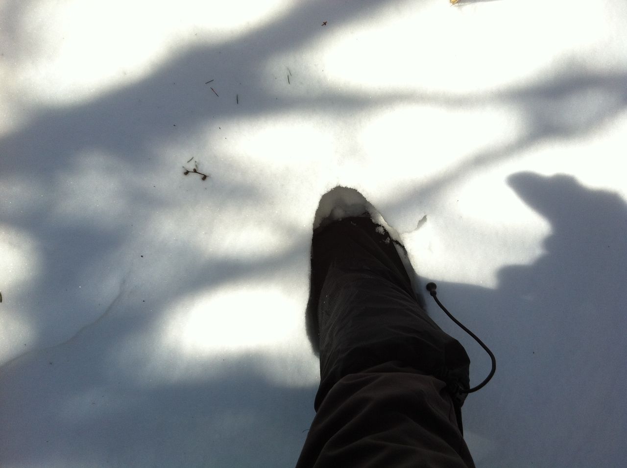 ここから急に雪の積雪量が増えました。しかもなかなかの長い急登。お互いに1回ずつ豪快に転倒したところでアイゼンを装着しました。僕たちの進む先にはトレースはなくあっても動物の足跡があるのみ。気づけば膝下から深いところ膝上まで積雪があり。途中でこれがラッセルってやつだと気づきました。初ラッセルです。