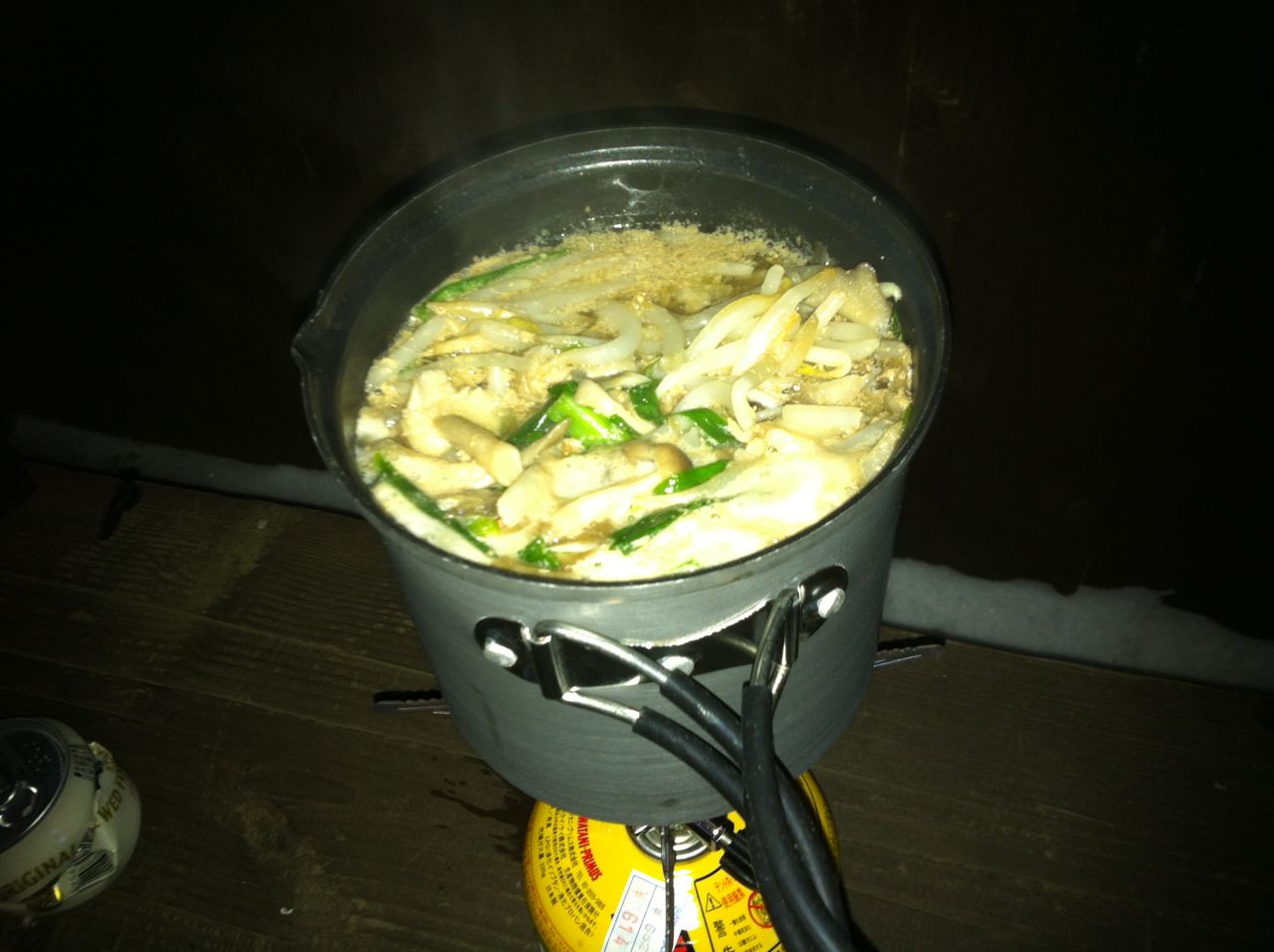 飯食べたら速攻就寝です。だかしかし、この後何度も目を覚すことに。まずはなんだか怖い夢を見て起こされたり、何者かに背中を押されている感じを受けて叫んで外に向かって蹴りを入れたり、あれはなんだったのか(笑)。まあそこまでは良かったのですが、「すごい寒いけど風なくてよかったねー」なんて話してたのに3時半頃突然の強風がしかも絶え間なく。山の天気はやはり突然変わるものですね。ゴーゴーゴーゴー風が遠くからどんどん近づいてくるのを感じます。恐怖でした。テントも潰されてしまうのではないかと思うほどに。それでも朝は止むだろうと思っておりました。
