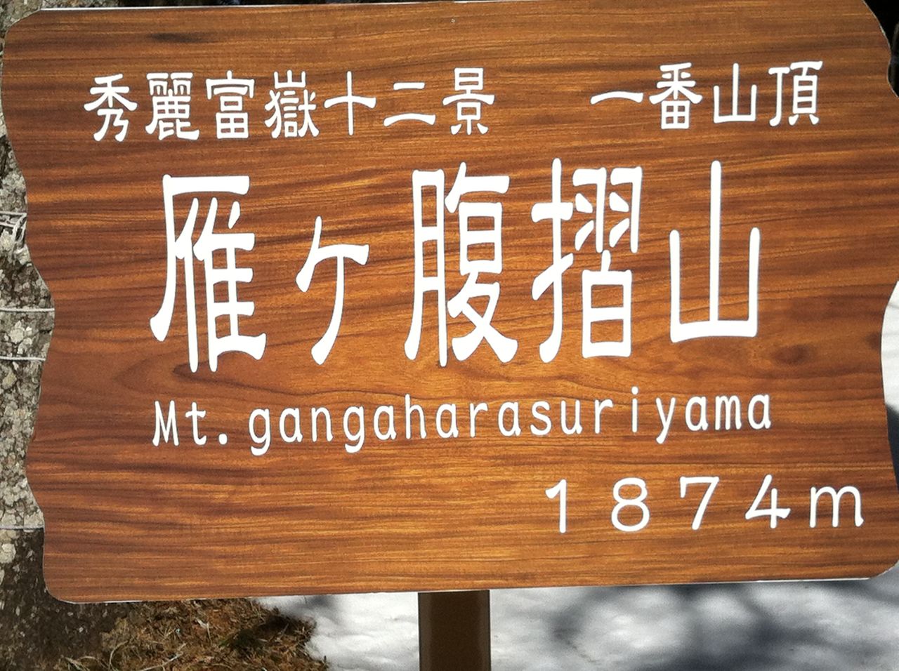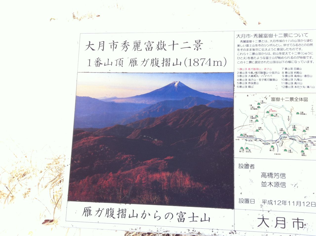 13時20分、雁ヶ原摺山山頂に到着です。長い距離をずーっとラッセルしてきました。こんなに大変な思いをして山頂に到着したのは初めてす。やはり雪山。姥子山の分岐からここまで約2時間とかなりのペースダウンです。もうクタクタですがかなり達成感がありました。楽しみにしていた富士山の展望は雲に覆われ残念な感じです。