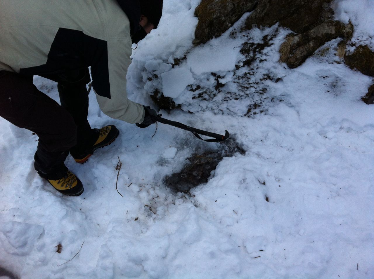 昨日、耳を澄まして野生の感を頼りにピッケルで雪を掘り起し探し出した貴重な水場です。有難く感謝し頂きます。