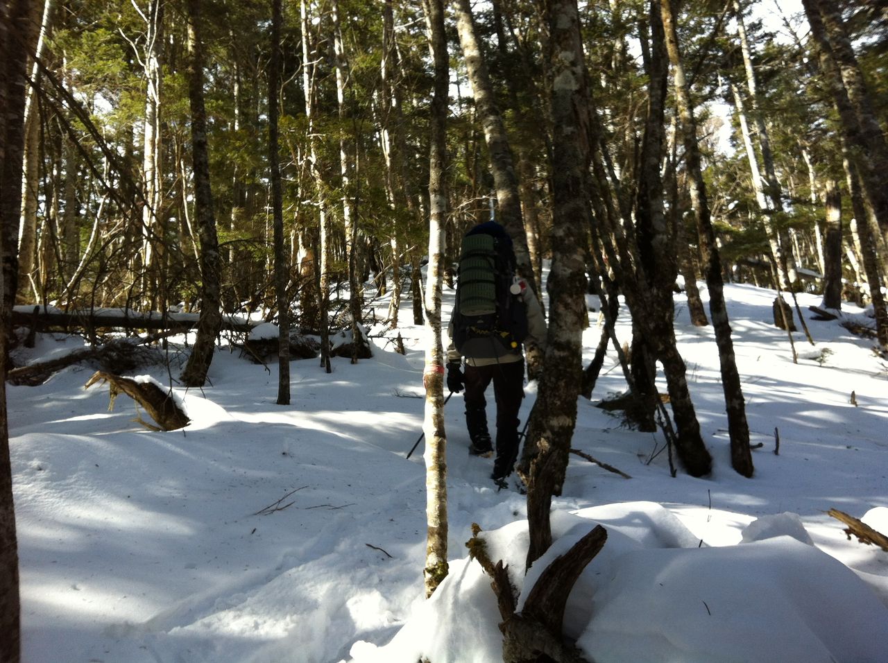 前日もそうでしたが雪で進むべき道の判断が難く迷うことが今回は何度もありました。山と高原のアプリで現在地を確認したり、地図で確認したり、目印(赤テープ)を目を凝らし探したり時には来た道を引き返したり。無積雪期ではない山の難しさを感じました。